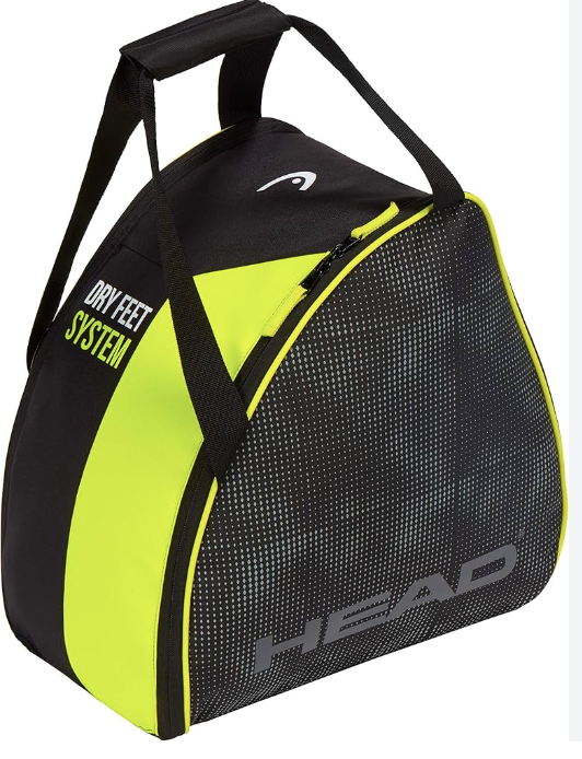 HEAD Ski Boot Bag: large main compartment with additional front pocket. Grommets for breathability. Durable and water-resistant fabric. Padded shoulder straps and top handle.