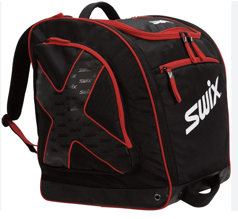 Swix Norwegian National Team Ski Boot Bag: large main compartment with side accessory pockets. Ventilated design to keep boots dry. Durable and water-resistant fabric. Padded backpack straps and top handle.