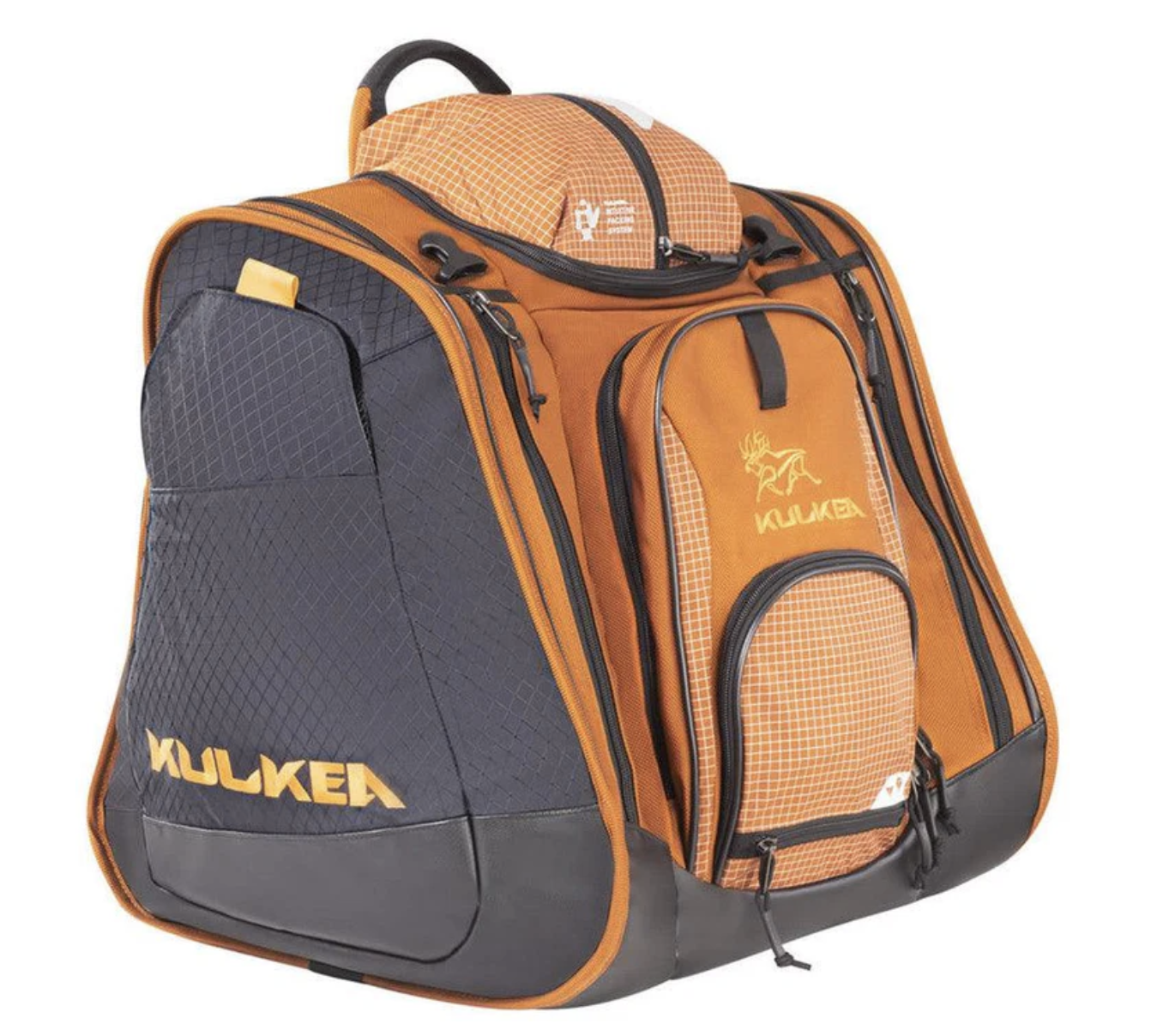 KULKEA Boot Trekker Ski Boot Bag: large top-loading compartment for boots, helmet, and gear. Dedicated helmet and goggle pockets. Water-resistant and durable materials. Padded and contoured adjustable shoulder straps.