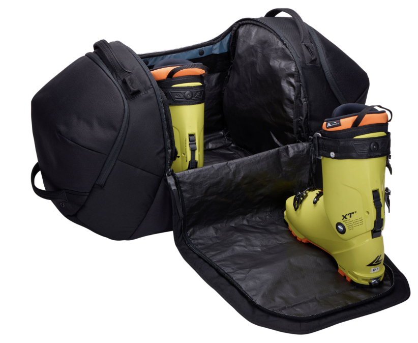 Thule Roundtrip Duffle 90L: 600D polyester, main compartment door doubles as a standing mat to change in and out of boots in any location, spacious main compartment for helmet, gloves, etc, 2 oversized side compartments for boots help balance the bag, padded, soft lined compartment for goggles, sunglasses, or phone, external lash webbing, water escapes through drain holes in boot compartments, padded shoulder straps and multiple grab handles, integrates w/any Thule RoundTrip Ski or Snowboard Bag.