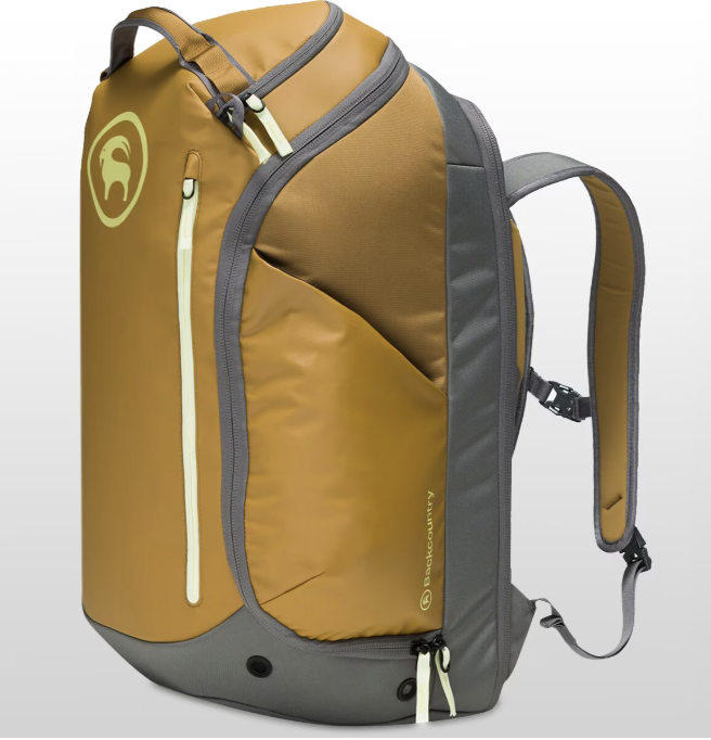 Backcountry Ski & Snowboard Boot Bag: modular carry, durable tarp materials, tear-resistant lining, opens flat into changing mat for added parking lot convenience, internal goggle pocket features a fleece lining to protect lenses, ventilation eyelets help your boots dry out during travel, zippered side pocket crafted to stash cozy apres-ski slippers, integrates with the Backcountry Double Ski and Snowboard bag.
