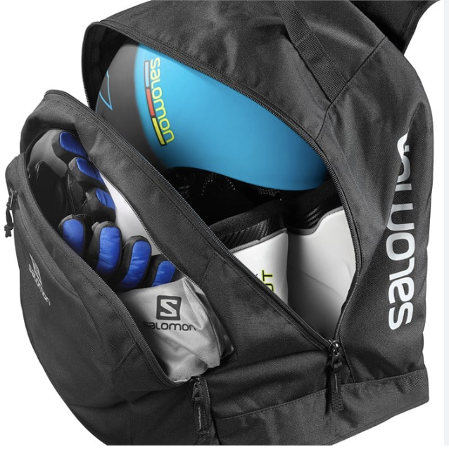 Salomon Original Gear Ski Boot Bag: large main compartment for boots, helmet, and accessories. Dedicated helmet and goggle pocket. 600D polyester fabric with a waterproof bottom. Padded shoulder straps and carry handle.
