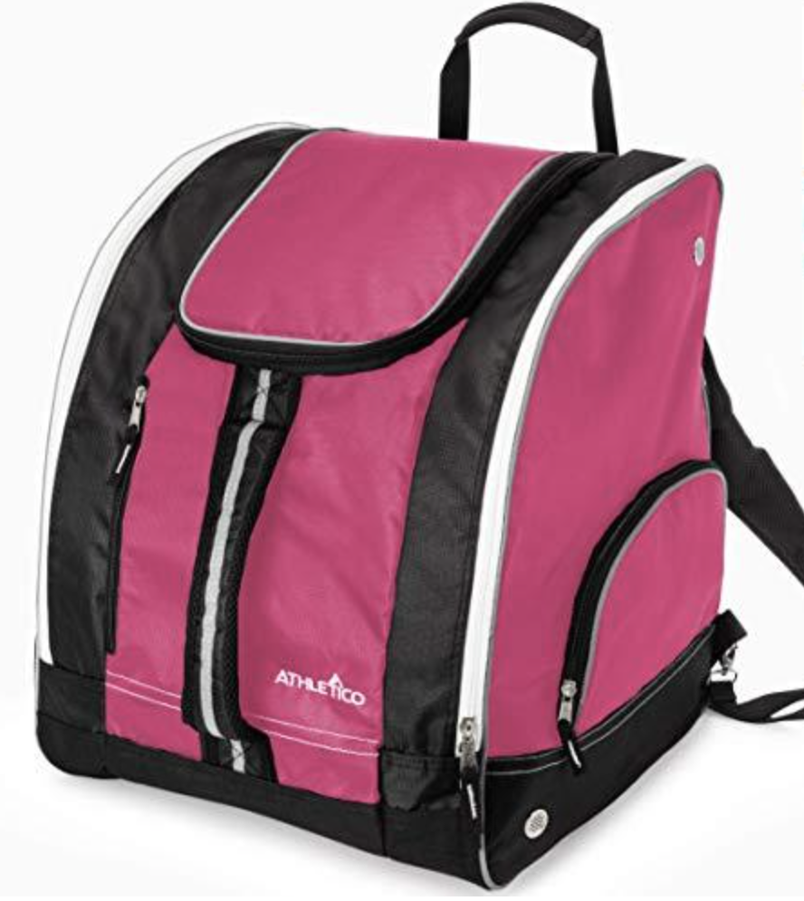 Athletico Ski Boot Bag: spacious main compartment for boots, helmet, and other gear. Grommets for ventilation to keep boots fresh. Water-resistant and abrasion-resistant polyester. Padded backpack straps for convenient carrying.