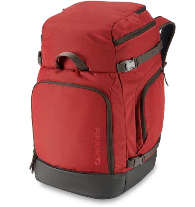 Dakine DLX 75L Boot Pack: constructed from 900-denier ripstop recycled polyester with a water-repellent finish that helps moisture bead up on the surface, tarp-lined boot compartment (accessible via the back panel), large, padded pocket for your helmet and goggles, top and front zippered cargo pockets, 2 large zippered side pockets, side webbing straps for compression and attaching gear, ID patch.