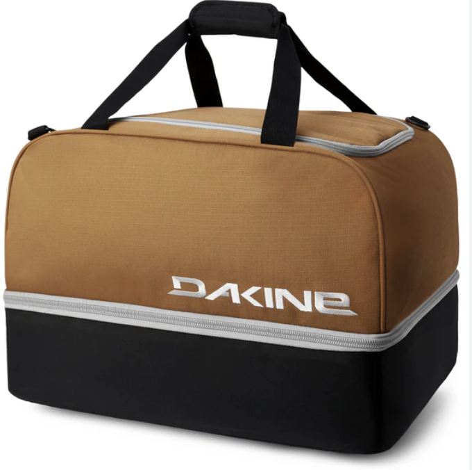 Dakine Boot Locker 69L Ski Boot Bag: tarp-lined bottom compartment for boots, separate helmet pocket. Zippered front pocket for accessories. 600D polyester with a weather-resistant finish. Adjustable and removable padded shoulder strap.