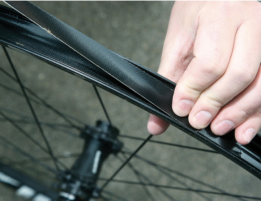 Press the tape firmly into the rim using your fingers or a tire lever to ensure a tight seal.